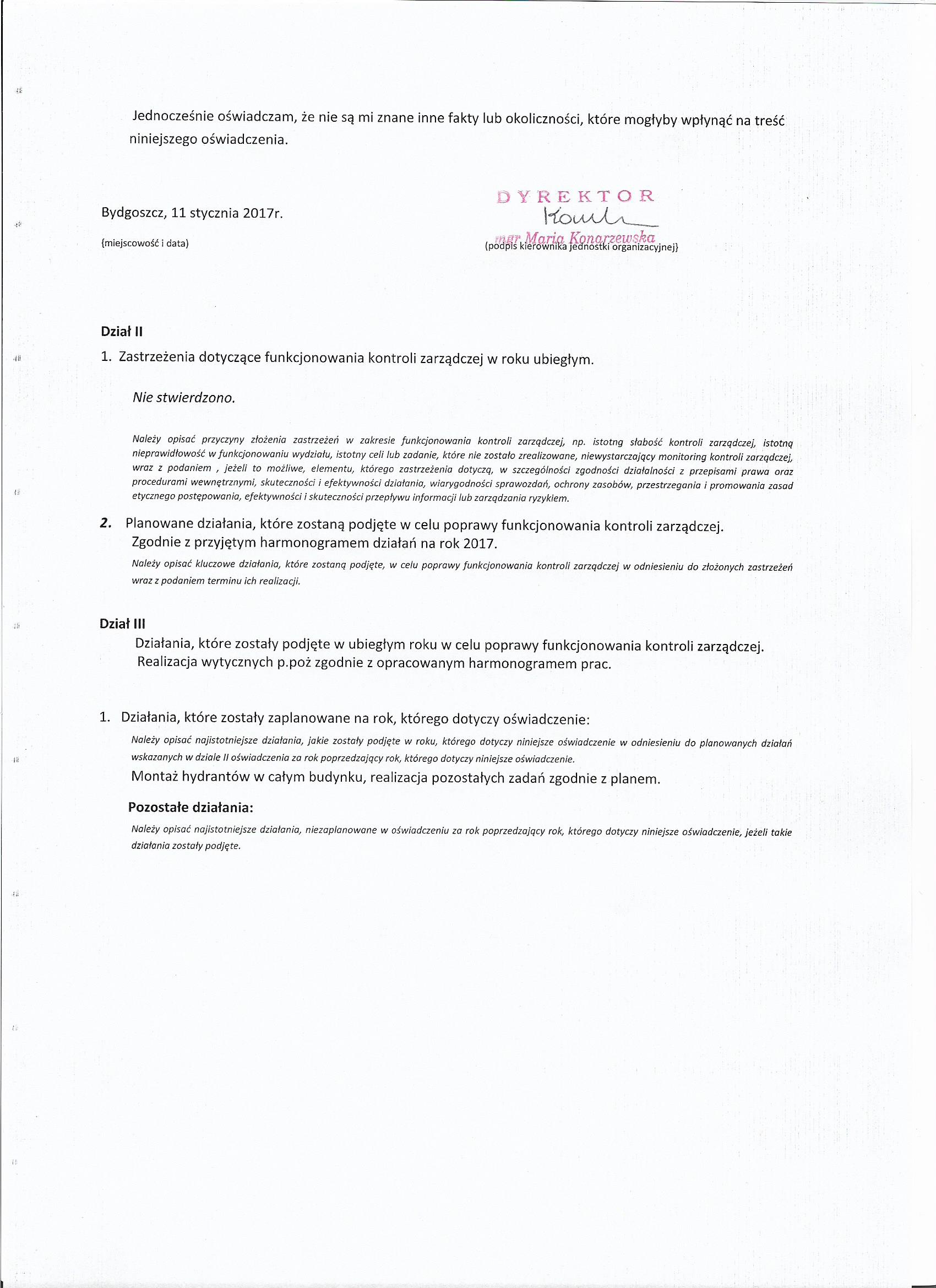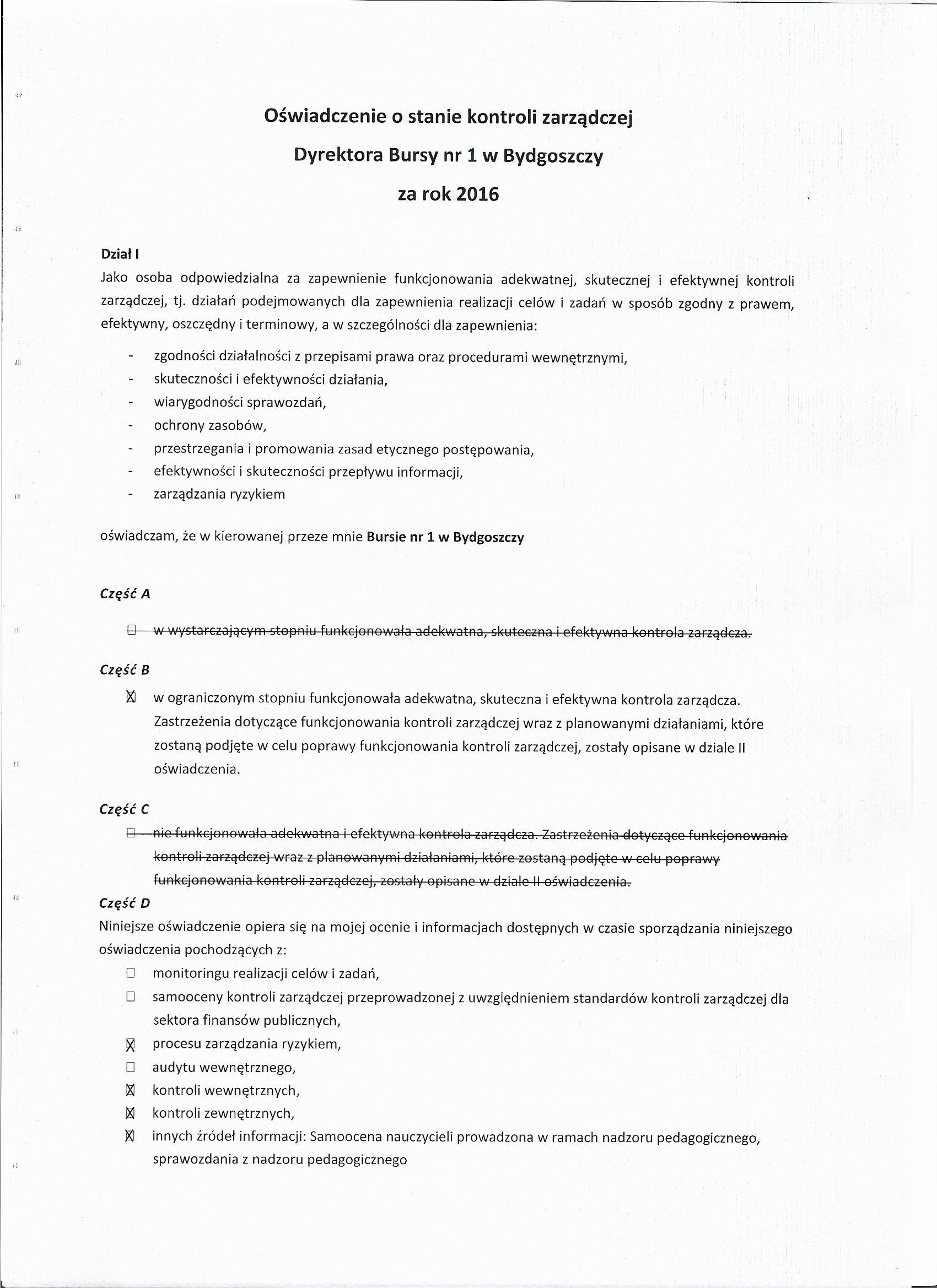Oświadczenie o stanie kontroli zarządczej 2016