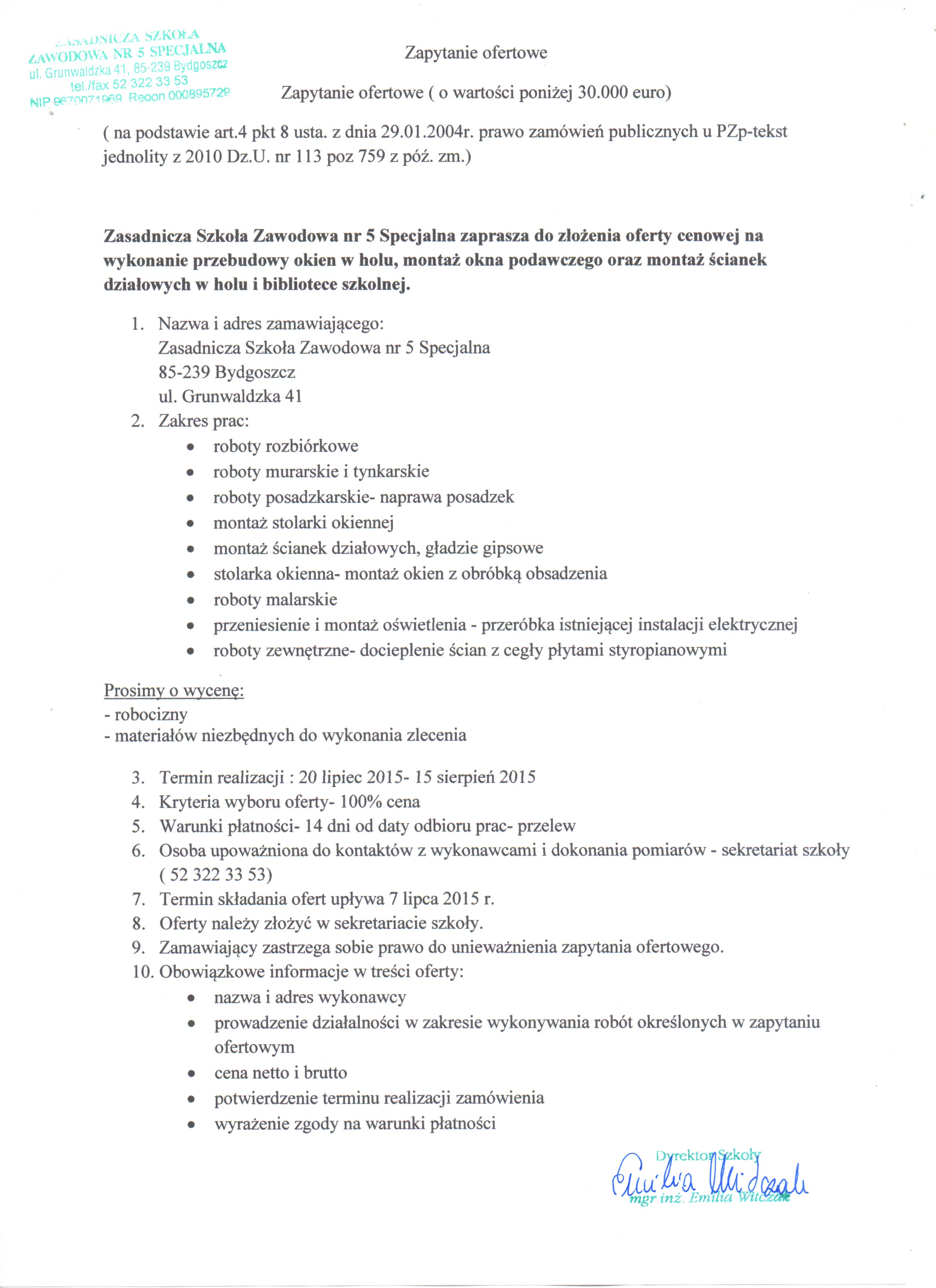 W dniu 08.07.2015 r. w wyniku przeprowadzonego postępowania weryfikacyjnego złożonych przez firmy ofert na wykonanie przebudowy okien holu, montaż okna podawczego oraz montaż ścianek działowych w holu i bibliotece szkolnej komisja na wykonawcę usługi wybrała: Firmę GBRW Anna Rudnicka z Bydgoszczy. Kryterium decydującym była cena za wykonaną usługę.