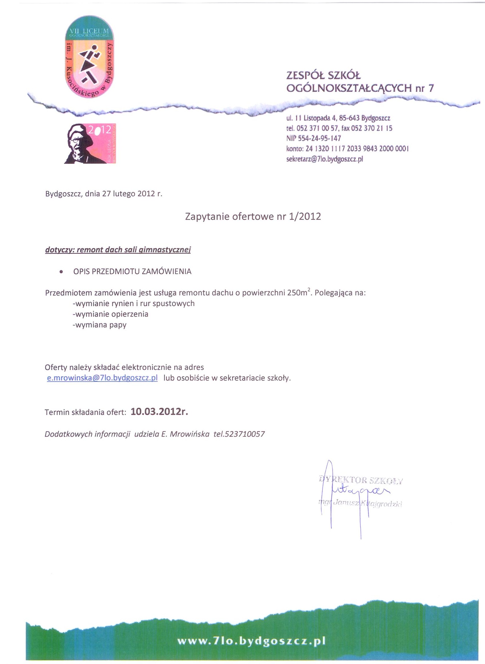 Zapytanie ofertowe Nr 1/2012 zostało unieważnione, ponieważ placówka nie otrzymała środków finansowych na remont dachu sali gimnastycznej.