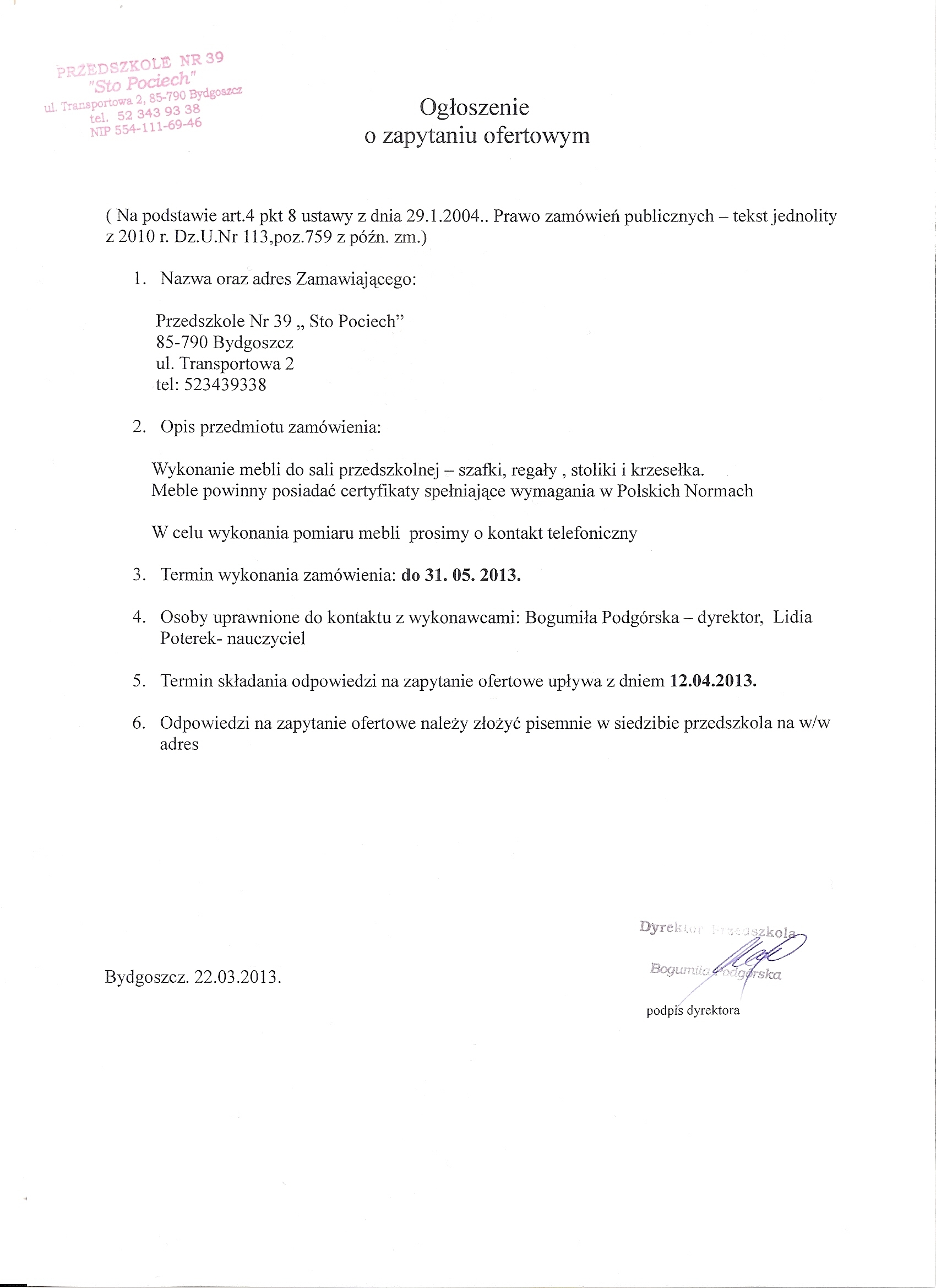 W wyniku zapytania ofertowego na wykonanie mebli do sali przedszkolnej wybrano: