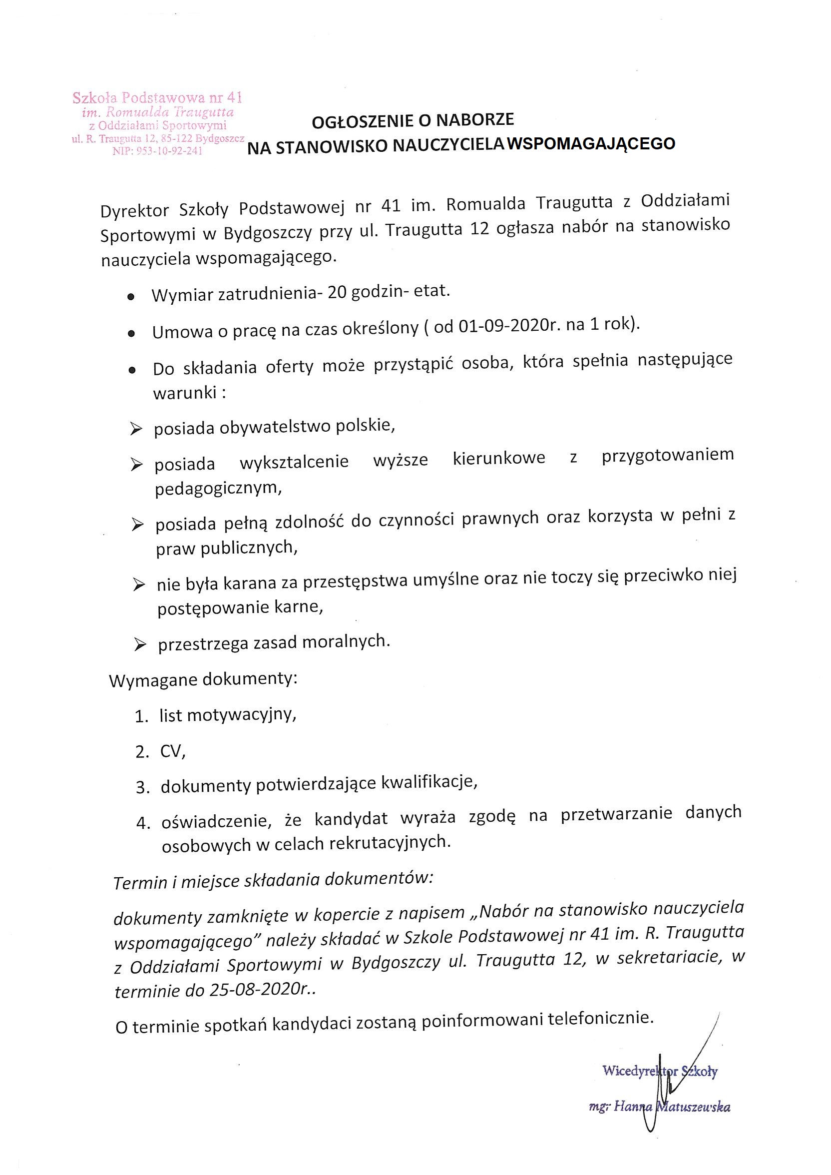 Dyrektor Szkoły Podstawowej nr 41 z Oddziałami Sportowymi w Bydgoszczy ogłasza nabór na stanowiska nauczyciela wspomagającego.