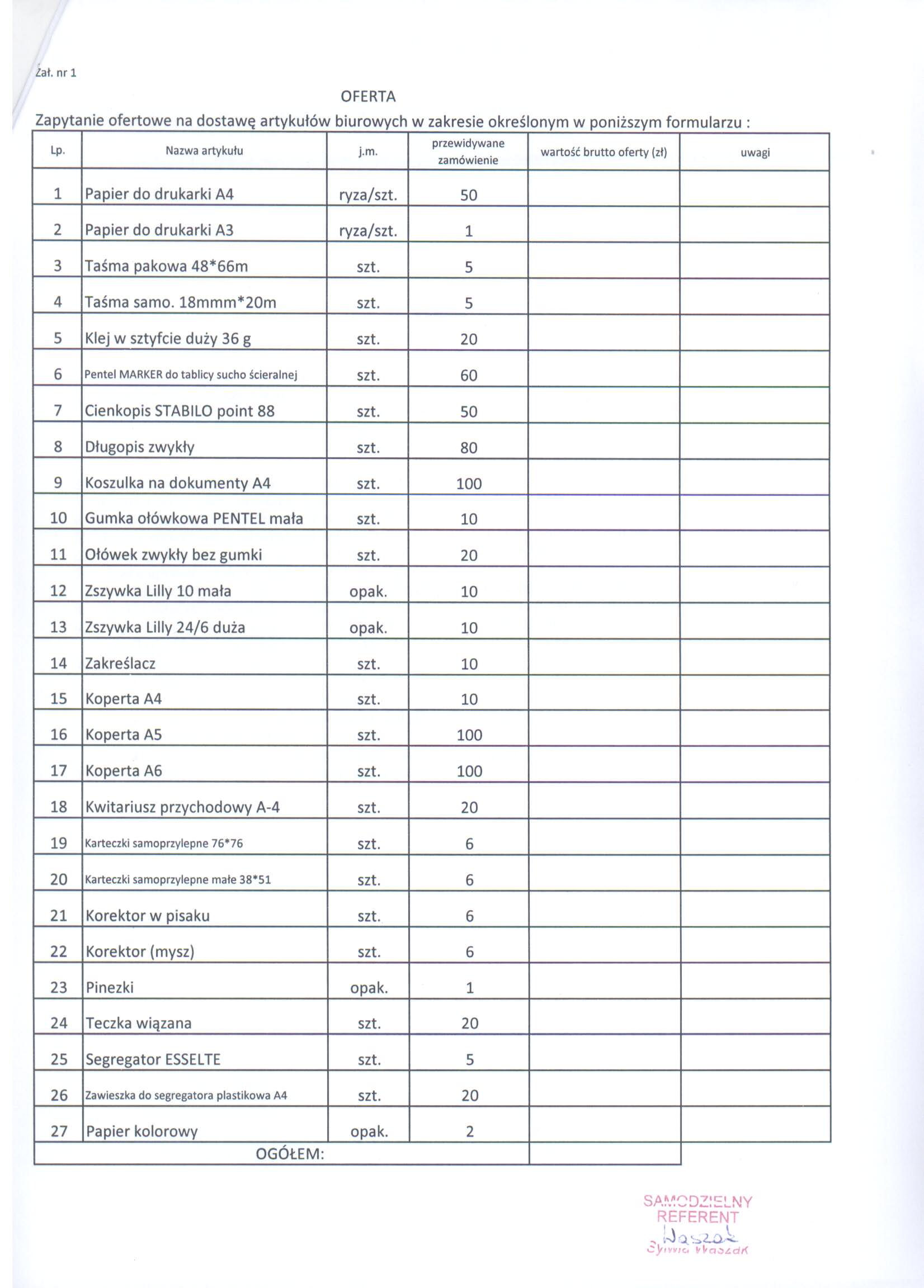 sekretariacie z dopiskiem „Oferta na artykuły biurowe”