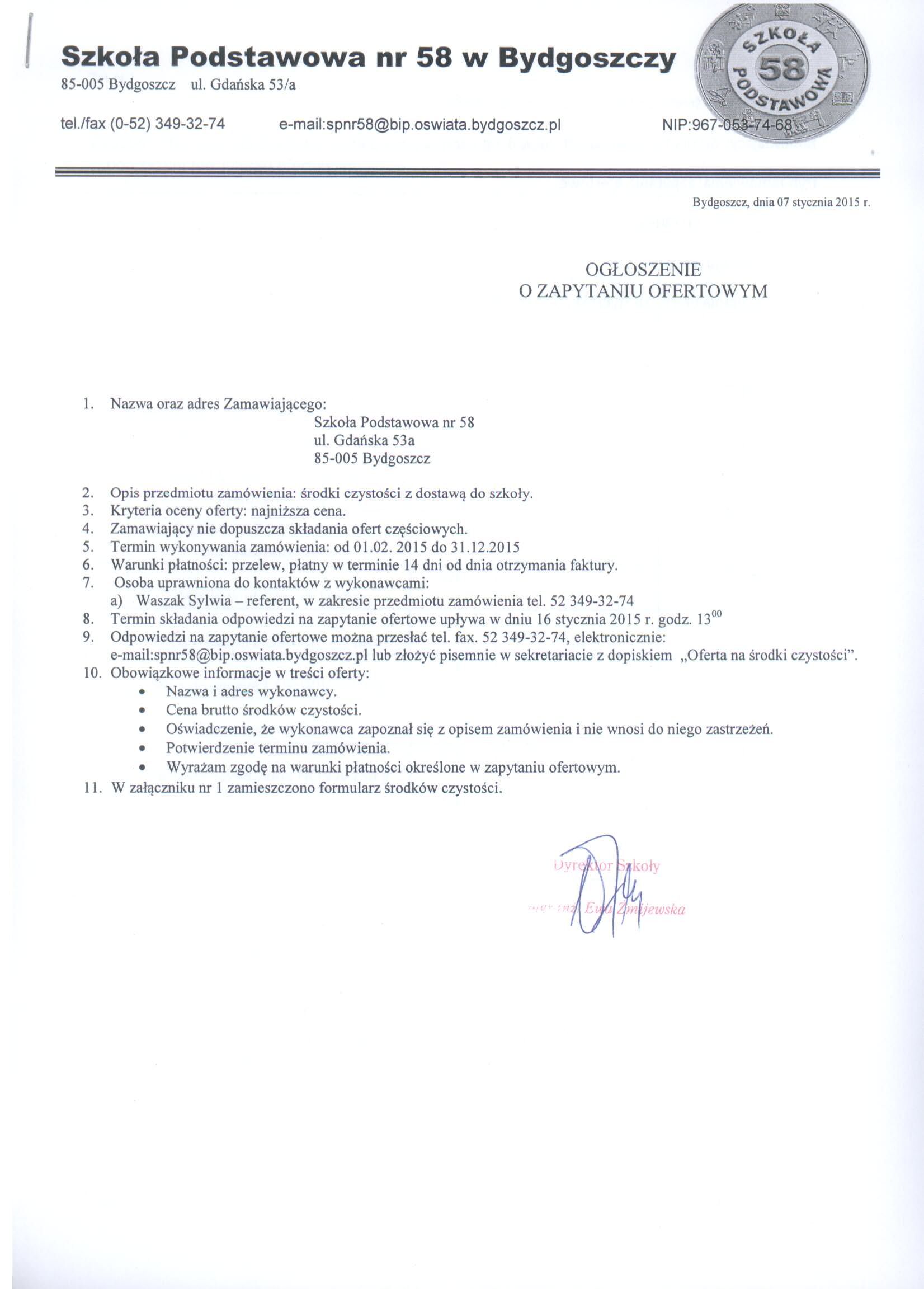 9. Odpowiedzi na zapytanie ofertowe można przesłać tel. fax. 52 349-32-74, elektronicznie: e-mail:spnr58@bip.oswiata.bydgoszcz.pl lub złożyć pisemnie w sekretariacie z dopiskiem „Oferta na środki czystości”.