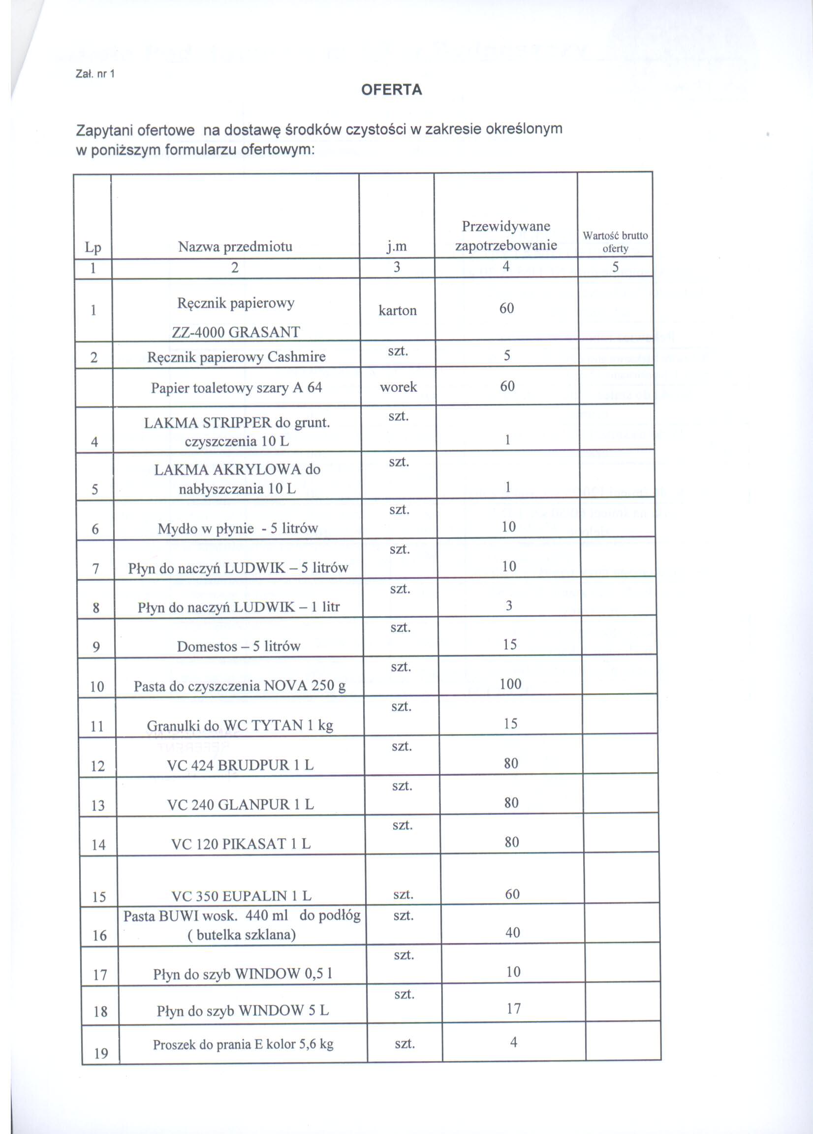 11. W załączniku nr 1 zamieszczono formularz środków czystości.