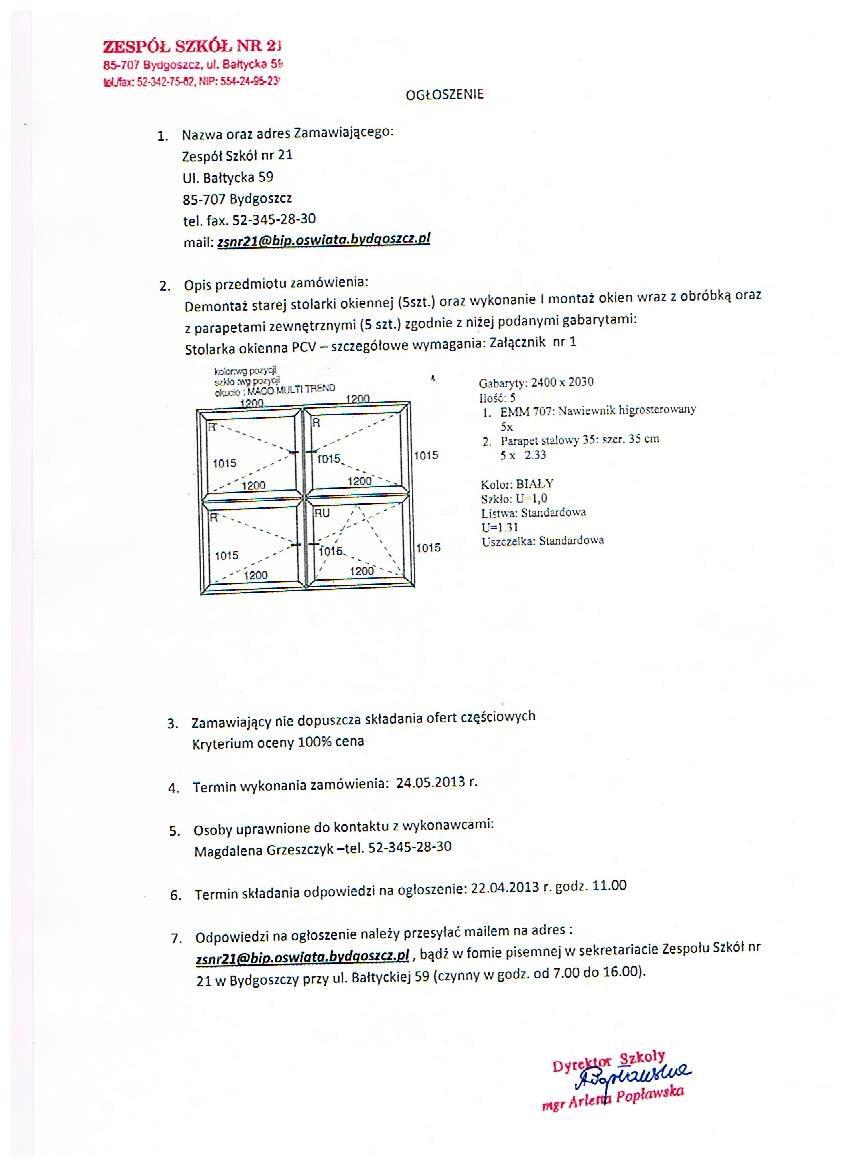 W wyznaczonym terminie zostało złożonych 9 ofert. Najkorzystniejszą ofertę złożyła firma SZYMPOL ul. Równinna 8 87-100 Toruń na kwotę 7982,70 zł