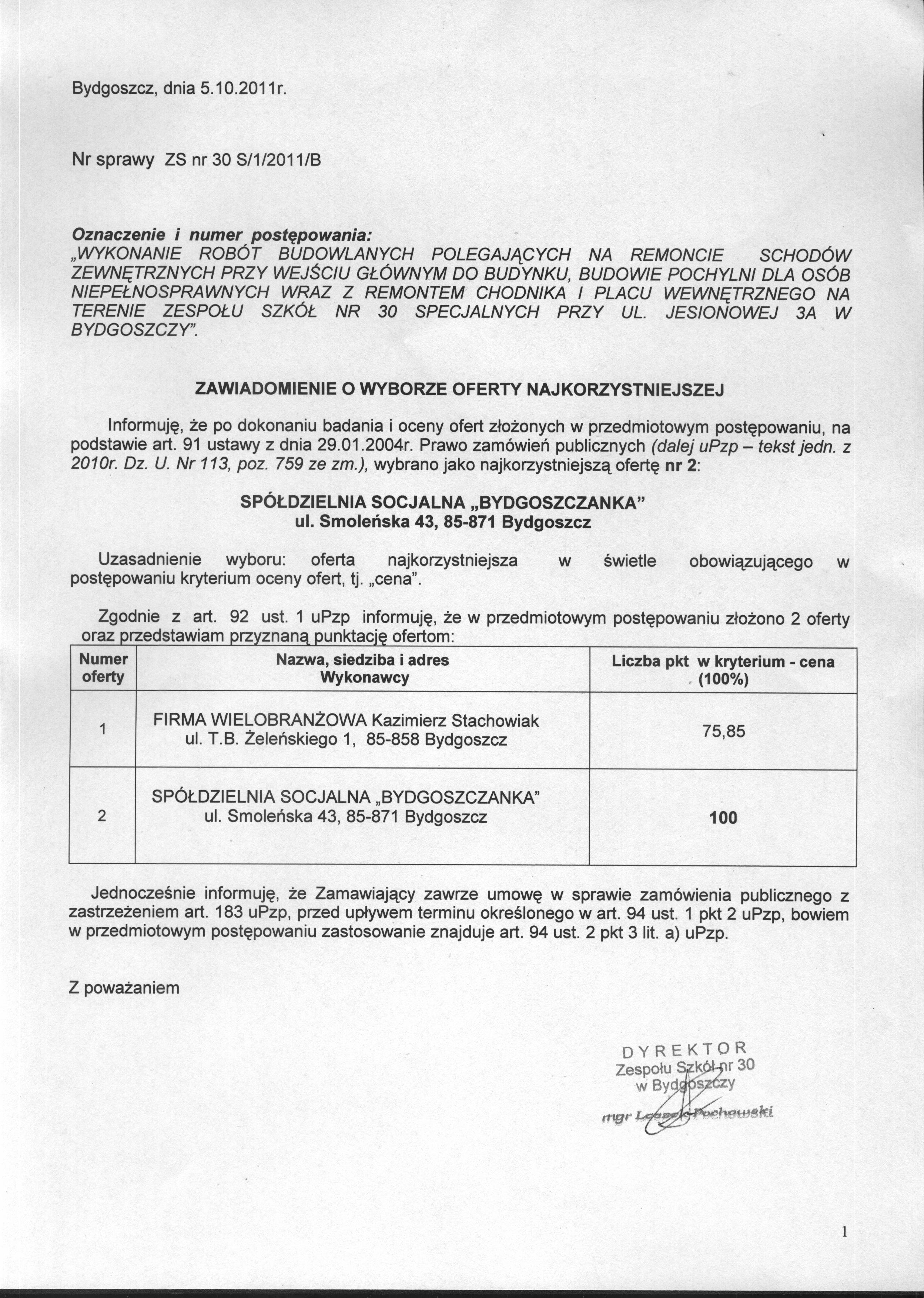 Remont schodów zewnętrznych przy wejściu głównym do budynku, budowie pochylni dla osób niepełnosprawnych, remont chodnika i placu wewnętrznego na terenie ZS nr 30
