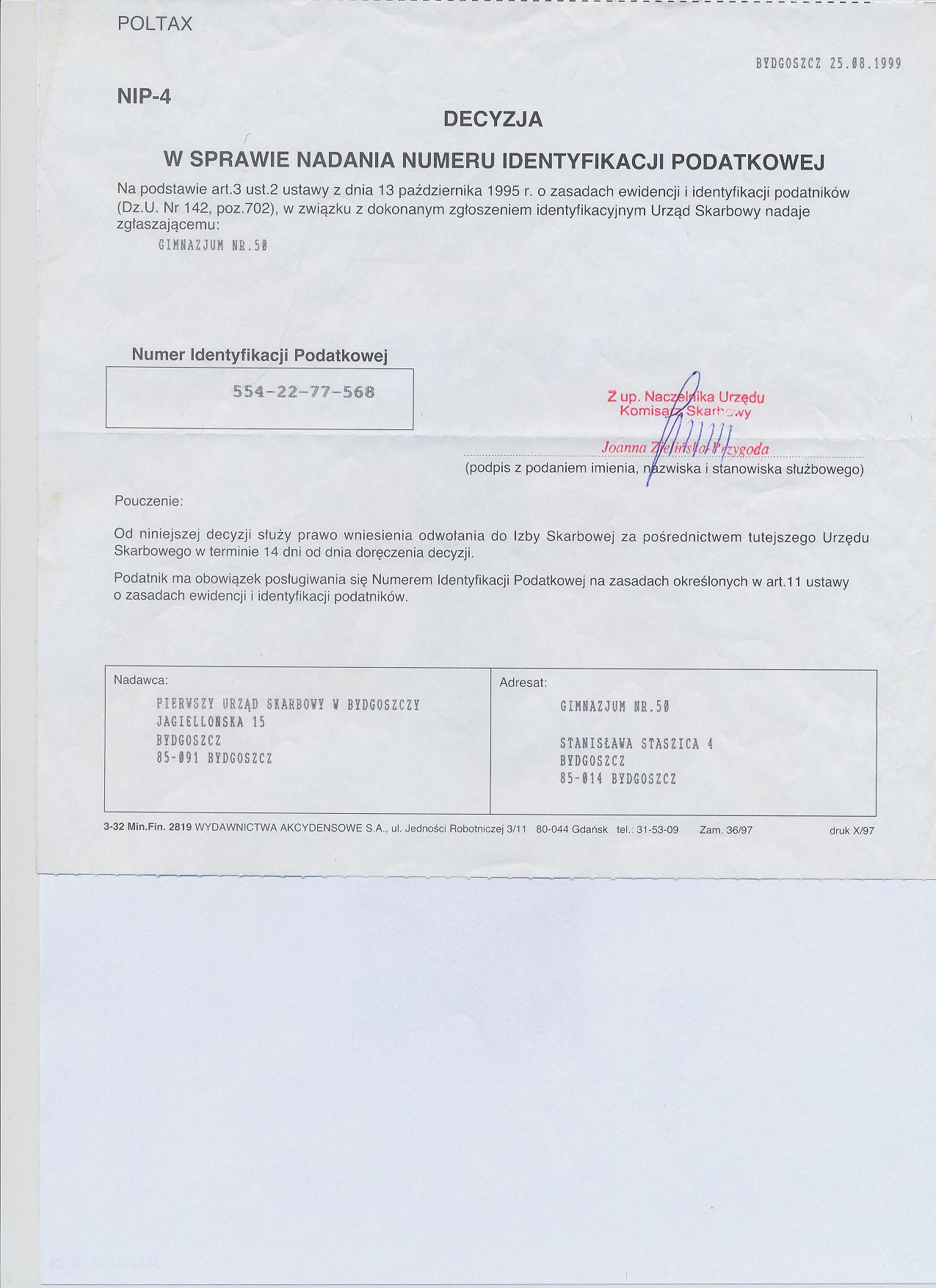 Status prawny - uchwała Rady Miast w sprawie utworzenia Gimnazjum nr 50
