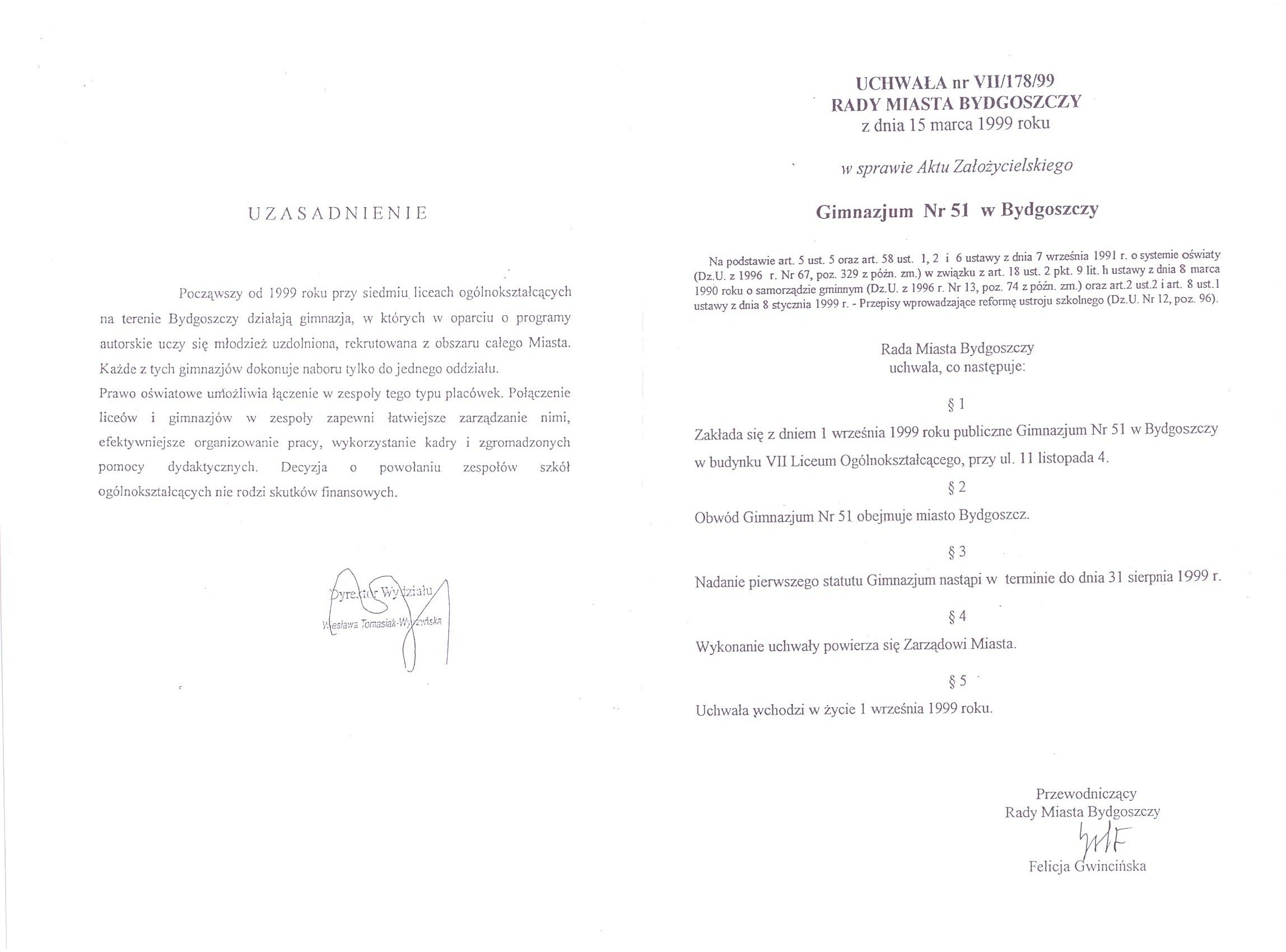 Uchwała Rady Miasta nr VII/178/99 z dn. 15.03.1999 r. w sprawie Aktu Założycielskiego Gimnazjum nr 51 w Bydgoszczy